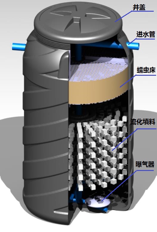 “京罐”是“净化槽”升级版,解决了“净化槽”出水总氮不稳定和污泥处置与排放难题,“京罐”内部填装有生物流化填料,污水中的有机物大部分通过生物填料时被去除。同时反应器内部存有较高的污泥量,与流化填料一起形成好氧泥膜共生曝气系统,由鼓风机将空气注入水中,在好氧微生物的帮助下水里的有机物得到降解,氨氮被氧化,填料内部形成缺氧去和厌氧区,协同降解处理污水中的总氮和总磷,处理后水流入顶部的蠕虫床层,在那里经过蠕虫对污泥的深度净化后(几乎不产泥)排放。