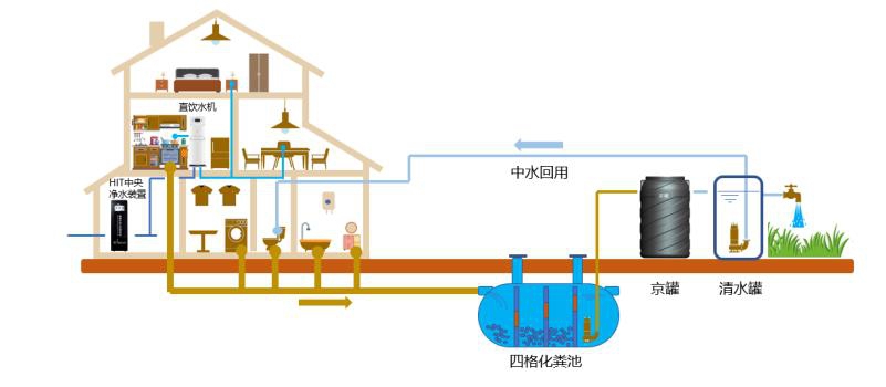 “京罐”主要用来处理农户家庭排放的粪便污水和灰色污水(厨房、浴室、洗衣等污水),是一种分散式污水处理设备,安装在农户院落内,污水处理达标后的中水直接就地回用,设备具有五大优势: